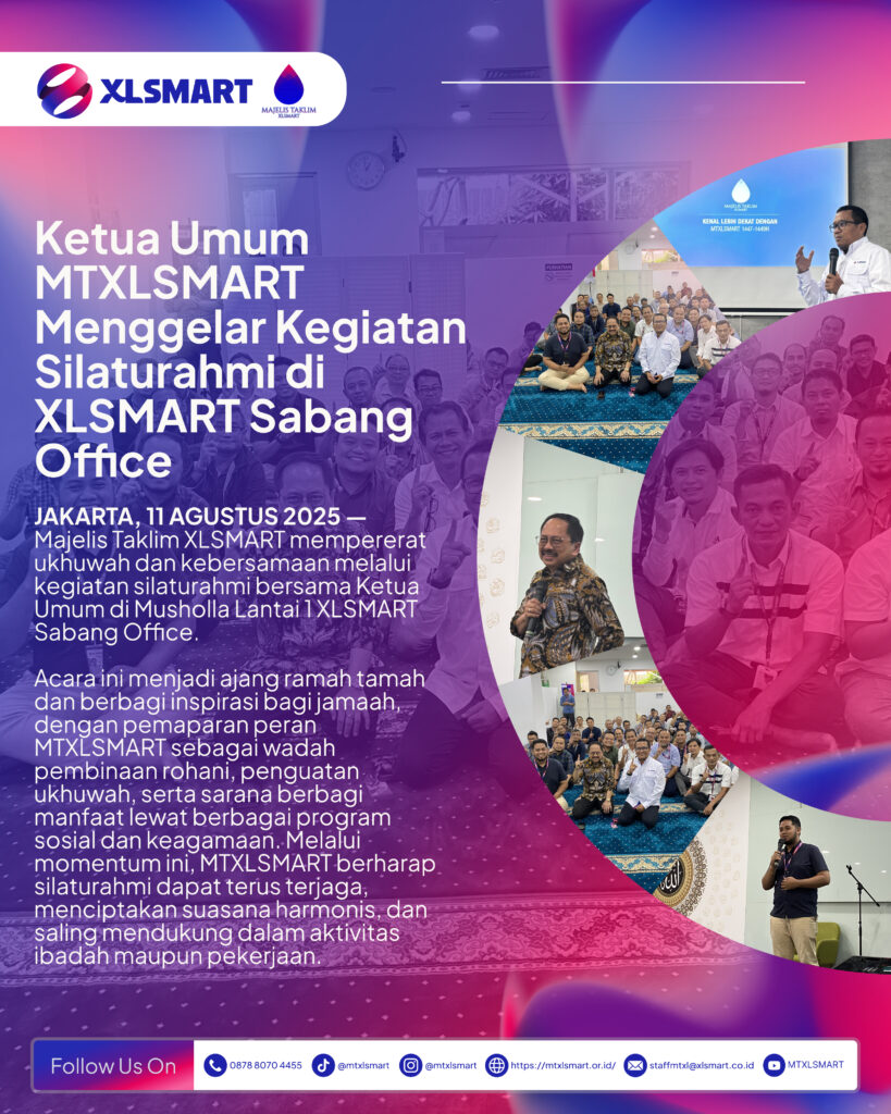 JAKARTA, 11 AGUSTUS 2025 — Majelis Taklim XLSMART menggelar kegiatan silaturahmi bersama Ketua Umum Majelis TaklimXLSMART, yang berlangsung di Musholla Lantai 1 XLSMART Sabang Office pada Senin, 11 Agustus 2025.