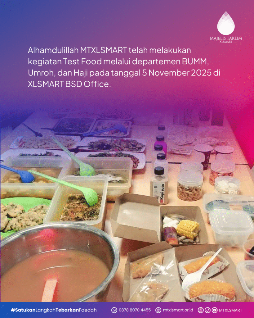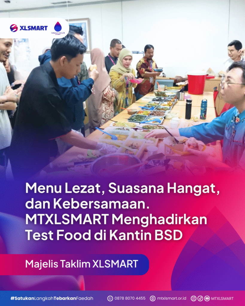 JAKARTA, 5 November 2025 — Majelis Taklim XLSMART (MTXLSMART) melalui Departemen BUMM, Umroh, dan Haji menggelar kegiatan Test Food untuk Kantin XLSMART BSD Office. Kegiatan ini dilaksanakan pada Rabu, 5 November 2025, sebagai bagian dari persiapan pembukaan kantin yang akan melayani kebutuhan makan para karyawan.