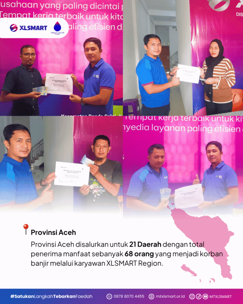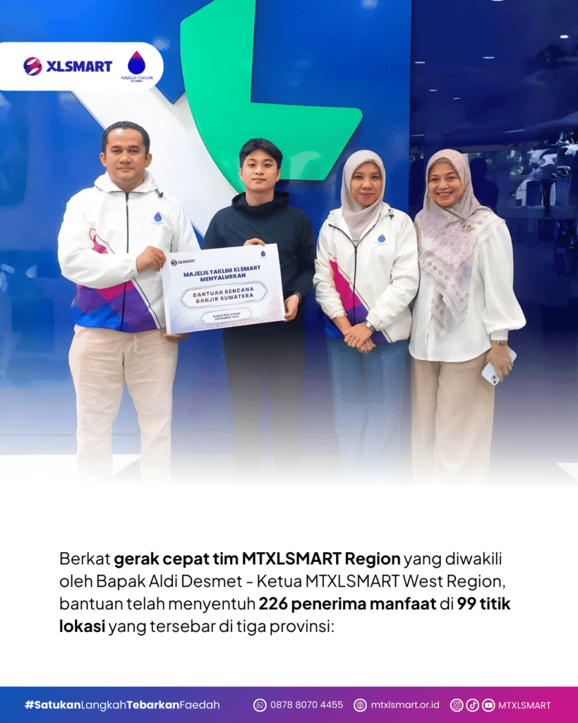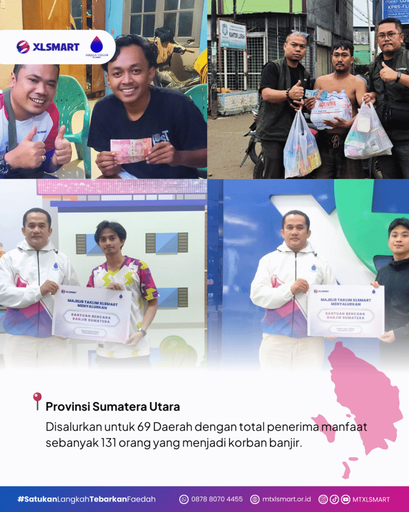 Melalui gerak cepat tim MTXLSMART Region yang diwakili oleh Bapak Aldi Desmet selaku Tim MTXLSMART West Region, bantuan berhasil menjangkau 226 penerima manfaat di 99 titiklokasi pada tiga provinsi. Penyaluran dilakukan kepada warga terdampak di Provinsi Sumatera Barat, Aceh, dan Sumatera Utara, yang secara keseluruhan mencakup 9 daerah di Sumatera Barat (27 penerima manfaat), 21 daerah di Aceh (68 penerima manfaat), serta 69 daerah di Sumatera Utara (131 penerima manfaat). Seluruh bantuan disalurkan melalui koordinasi bersama karyawan XLSMART Region yang turut memastikan amanah tersampaikan dengan tepat sasaran.
